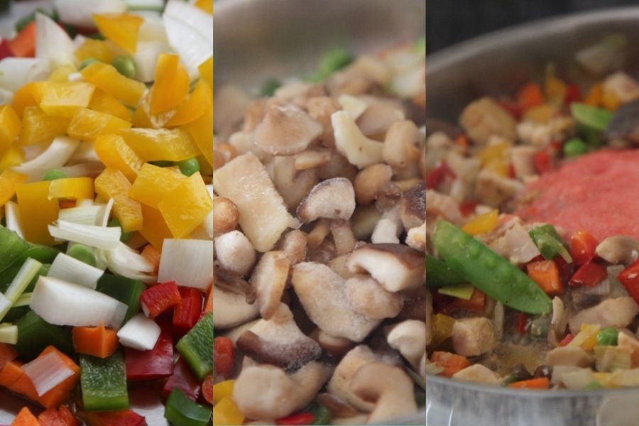 Mi arroz con setas y tirabeques de hoy lleva pimientos de colores, cada uno con su dulzor y su peculiaridad. Una picante cebolleta, unos verdes guisantes, zanahorias y un variado generoso de setas que se cocinan suavemente con un buen caldo de verduras y el aroma de un buen vino blanco. Después entran en escena unos dados de pavo y por supuesto un grano de arroz redondo que absorberá todos estos sabores para regalarnos un plato completo y único.