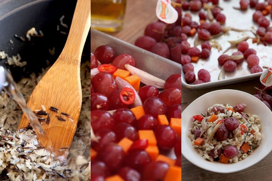 Estamos en plena temporada de uvas y encontrar las más dulces y carnosas es muy fácil cuando entre todas ellas destaca un sello de Denominación de Origen Protegido. Es el caso de la Uva de mesa embolsada de Vinalopó. Una uva jugosa, equilibrada, dulce, suave y perfecta para disfrutarla recién desprendida de su racimo en cualquier momento del día. Pero también, para incluirla como ingrediente estrella en tus salsas de carnes blancas y pescados, para hacerlas en pocos minutos borrachas en ron o para cocinar con ellas increíbles platos salados muy fáciles de preparar como este arroz salvaje con uvas red globe.