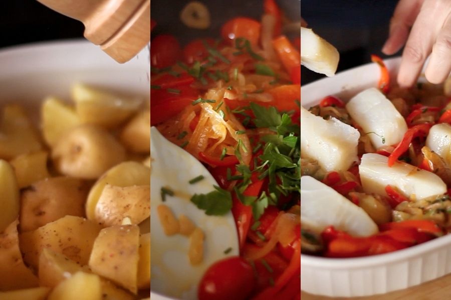 La receta de este bacalao horneado nació una mañana en la que no tenía ningún plan de comida para preparar. Abrí la nevera y me dije: – ¿qué hago con esto, y con esto, y con ….? bacalao, cherrys, pimiento rojo…– Entonces, cerré mis ojos y de repente apareció en escena; la cebolla, las patatas, el cebollino, el perejil…. y así, poco a poco, guiándome por los hermosos colores de este plato y por esa inspiración que a veces se presenta sin llamar, completé este sabroso bacalao horneado con patatas y cherry que hoy te invito a que lo prepares y descubras todo lo bueno que en él se encierra.