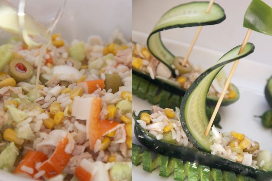 Llega el fin de semana y una buena manera de tener entretenidos a los más pequeños de la casa es que nos ayuden a cocinar estos barquitos de pepino con ensalada de arroz.