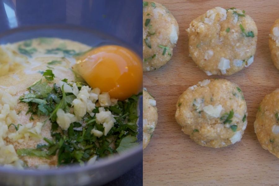 Haz con la masa pequeñas bolitas, aplástalas con las palmas de las manos y fríelas en abundante aceite de oliva durante unos minutos.