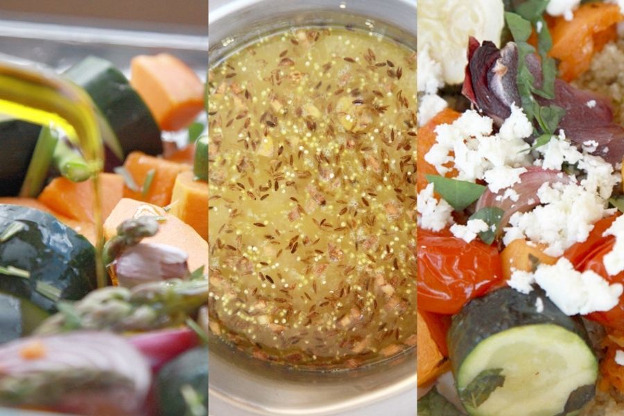 La receta de hoy lleva unas verduritas asadas con unas frescas hierbas aromáticas que penetran en ellas para abrazarlas y enaltecer su sabor. Una quinoa dorada cocida con comino y ajo, una cremosa vinagreta de mango y unas migas del salado queso feta. Todos ellos hacen que este plato sea fantástico para personas que siguen una dieta de control de peso. Y sobre todo, para personas celíacas o diabéticas, ya que este seudocereal no contiene gluten.