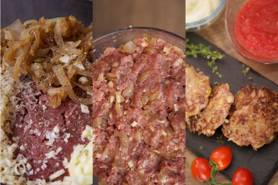 Mi receta de filetes rusos de hoy lleva carne de ternera roja, una cebolla previamente confitada, unos pequeños dados de manzana, un buen puñado del agrío queso cheddar, un toque de sal y otro de pimienta. Una mezcla para mí, perfecta equilibrada y absolutamente deliciosa.