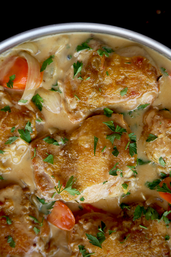 Un buen fricasé comienza por cocinar el pollo para embellecerlo y crear una piel dorada extra crujiente. Después unas verduras salteadas con el aromático tomillo y por último, una suave crema que poco a poco va cogiendo cuerpo y sabor para asegurar un resultado hogareño de lo más apetecible a simple vista.