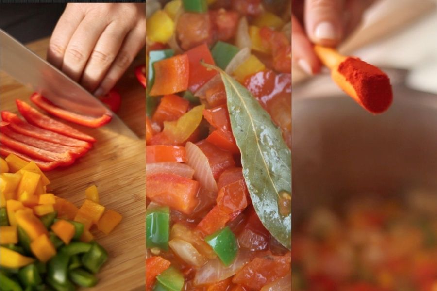 En una cazuela añade un generoso cordón de aceite de oliva y fríe las semillas de comino durante un minuto para que suelten toda su fragancia. Añade las verduras junto a la hoja de laurel, sazona al gusto y rehoga durante unos 5-7 minutos. Mueve constantemente para que salgan todos los sabores y sustancias de sus ingredientes.