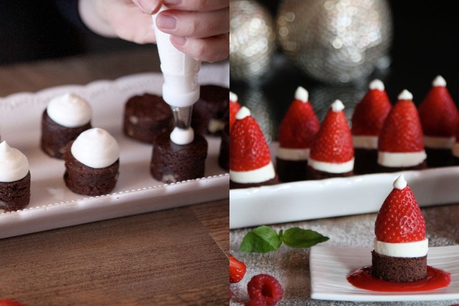 Presenta los gorritos Noel sobre un zigzag de coulis de frambuesa y descubre lo bien que sabe la Navidad.