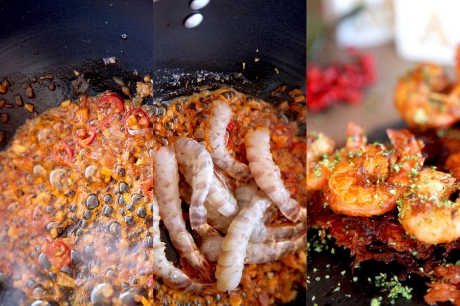 Puedes elegir entre unos langostinos tigre, las colas de una cigalas o los clásicos gambones, que siempre salen bien y además son más económicos. Pero si puedes permitírtelo, no lo dudes, decídete por los langostinos. Su cuerpo carnoso y su sabor ligeramente salino bailarán en tu sartén con algunas de las especias más profundas e intensas que van aportar el equilibrio perfecto para regalarte un plato final absolutamente increíble.