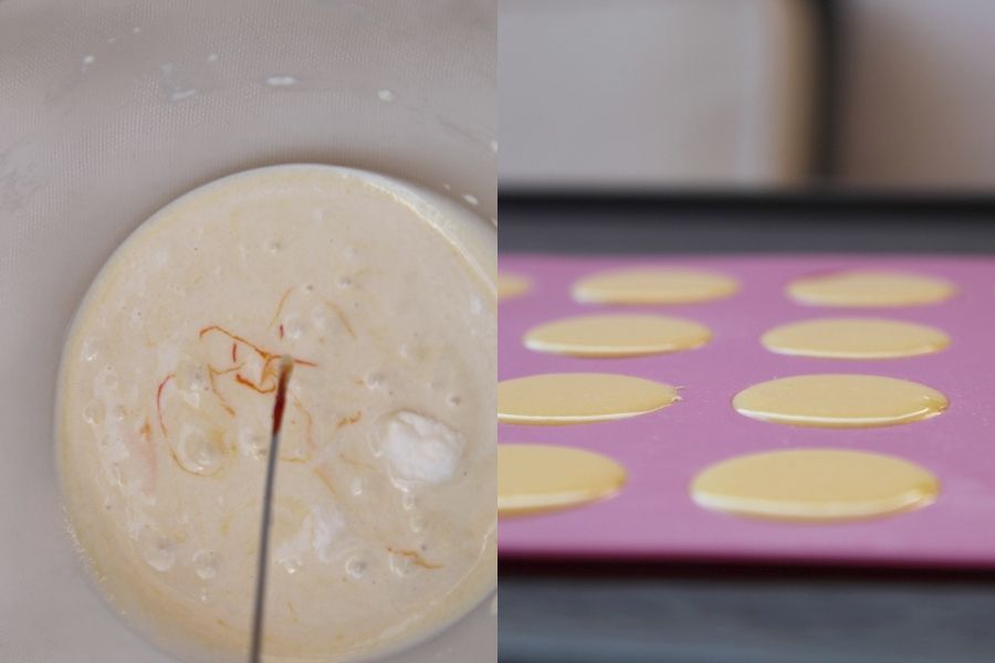 Ahora coloca el molde para hornear tus macarons sobre una bandeja.Suavemente y despacio pon la masa en una manga pastelera con un boquilla de ½ cm de diámetro. Rellena los huecos con mucha calma y nunca del todo, ya que la masa irá extendiendo poco a poco hasta completar el círculo. Al terminar, coge la bandeja sobre la que tienes el molde relleno y déjala caer sobre la mesa de trabajo para que alise la superficie del macaron y las burbujas de aire que hayan quedado suban y desaparezcan.Deja secar la masa en los moldes durante una hora antes de hornearlos. Comprueba que están secos tocando con la yema del dedo la superficie, cuando no se pegue nada de masa en el dedo, estarán listos.