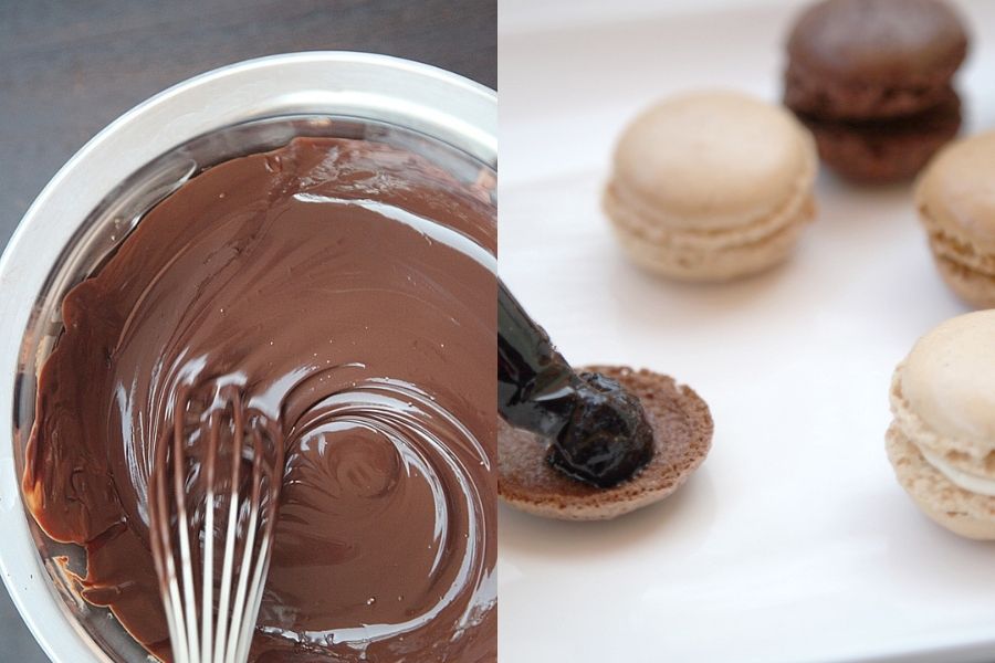 Deja enfriar los dos ganache antes de rellenar los macarons y no te olvides cubrirlos con papel film transparente para evitar que se forme una superficie plástica.Una vez fríos introduce el ganache en una manga pastelera y distribuye una pequeña cantidad en una de las mitades del macarons, después coloca la otra mitad encima y presiona un poquito hasta que la crema te llegue al borde.