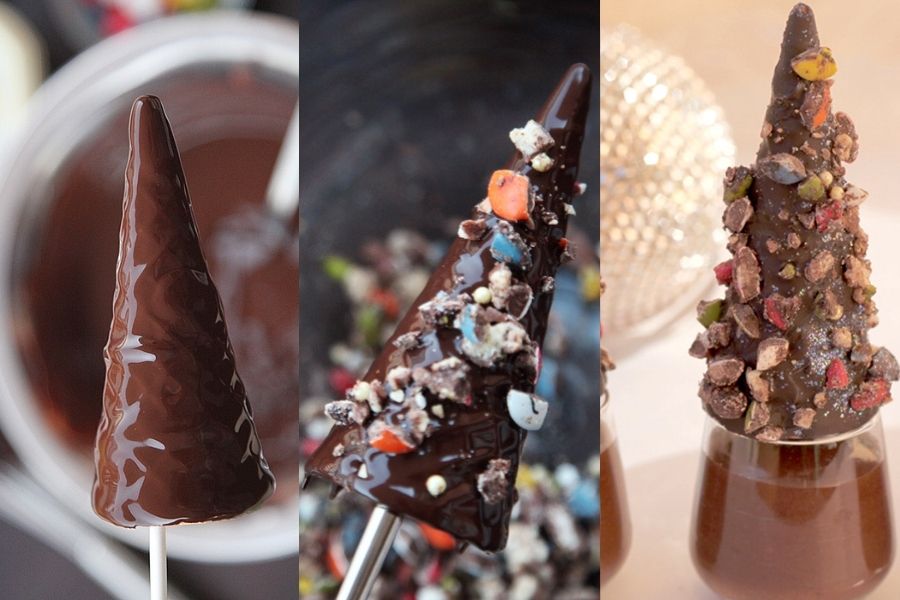 Un mousse de chocolate ligero, suave y aireado presentado con un crujiente barquillo, también de chocolate, adornado con alegres colores, lo convierte en un magnifico postre para la comida del día de Reyes. Los mas pequeños de la casa siempre que los ven lo relacionan con el árbol que han visto al despertar en su salón rodeado de juguetes. Y cuando me lo dicen con esa chispa brillante en sus ojos, todo mi trabajo recobra un maravilloso sentido.