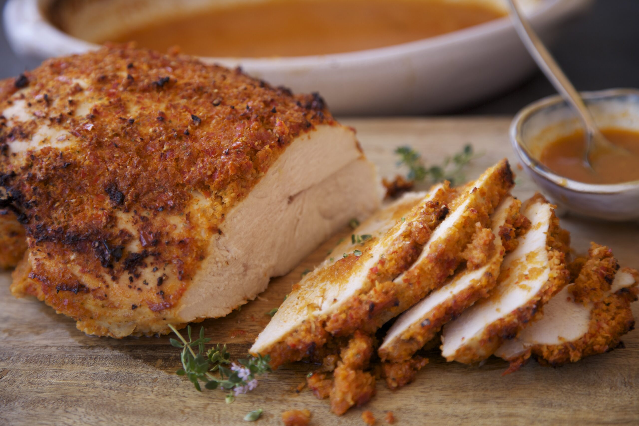 Jugosa, tierna, saludable e irresistible es ésta pechuga de pavo asada cubierta por una sabrosa capa de verduras trituradas y asada al horno lentamente para conservar toda su sustancia y sabor.