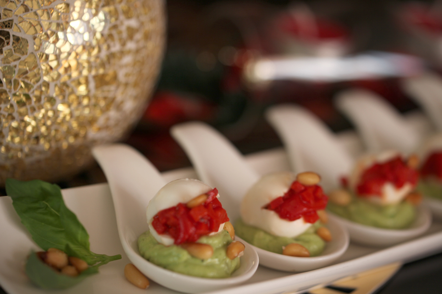 Y para ésta noche tan especial, he seleccionado como aperitivo de bienvenida el favorito de mi hermano David. Unos pequeños bocaditos de perlas de mozzarella rellenos de pimientos del piquillo sobre una espectacular crema de aguacate y albahaca adornado con crujientes piñones tostados.