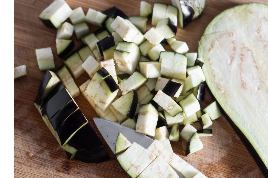 • Lava y corta la berenjena en cubos.
