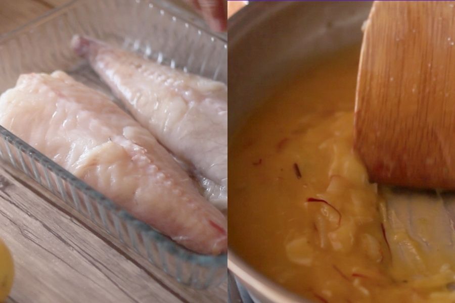 Comienza por limpiar bien las colas de rape, dispónlas en una fuente e introduce en el horno precalentado 20 minutos a 180º.No es necesario que añadas nada más, ya que lo que buscamos al hornearlo es que suelte todo su jugo repleto de sabor. De esta manera cuando calientes el rape con la salsa de azafrán antes de servir, ésta no se aguará y permanecerá intacta.
