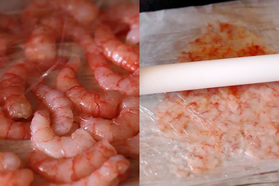 Una vez tengas las colas listas extiéndelas un poco separadas entre sí sobre papel sulfurizado y cúbrelas con plástico transparente. Coge un rodillo de cocina, aplasta dando pequeños golpes y haz rodar el rodillo sobre ellas hasta conseguir una capa fina. Introduce en el frigorífico o en congelador unos minutos para que endurezca un poquito.
