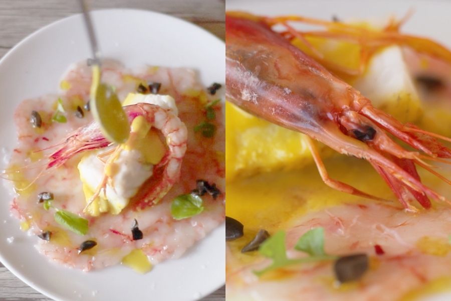 En NocheBuena, rape en salsa de azafrán con carpaccio de gambas