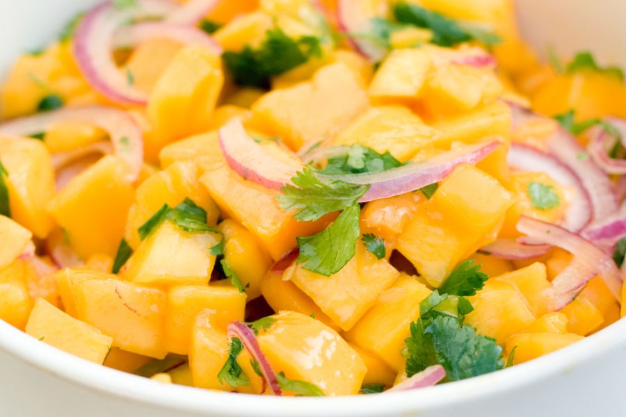Pica los mangos y el resto de las verduras en un tamaño pequeño. Agrega todo a un bol grande y adereza con la sal, la pimienta y el jugo de lima fresco.