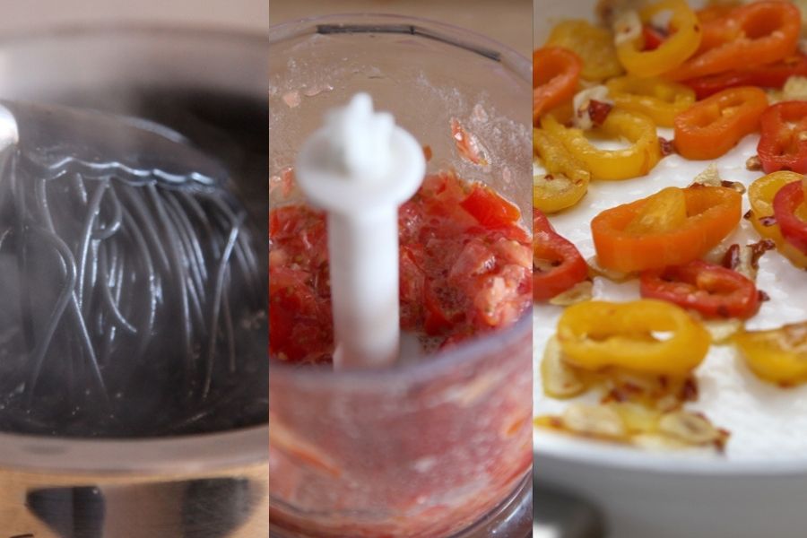 Esta receta de spaghetti al nero di seppia la tengo anotada en mi recetario desde 1988 con el nombre de Espagueti negro con gambas, sepia y copos de chile. Unos espagueti largos y perfumados en el delicado caldo, acompañados de pimiento dulce y crujiente, de gambas, del toque picante del chile, el frescor de la cebolleta y la húmeda y jugosa textura que aporta el tomate, convierten a este plato en una auténtica fiesta, que estoy segura, te hará muy feliz.