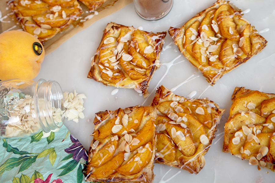 Extiende un poco de crema pastelera por cada cuadrado y coloca los gajos de melocotón en el centro.