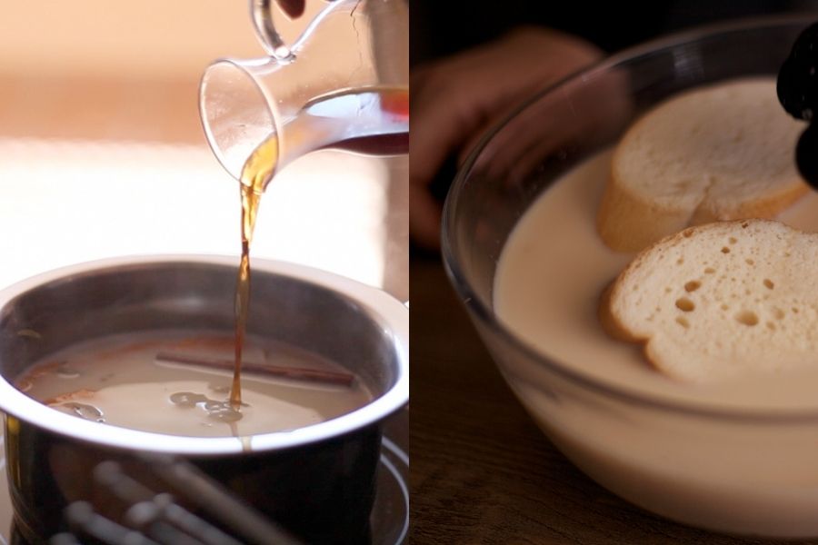 Corta el pan en rodajas gruesas de dos centímetros aproximadamente y sumérgelas en la leche fría infusionada, asegúrate de empapar todo su interior. Después, con las manos limpias, coge la rebanada en la palma de tu mano y mueve de arriba hacia abajo con decisión para retirar el exceso de leche.