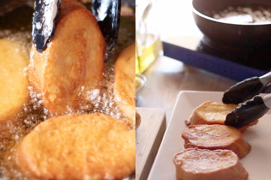Cuando pongas el aceite nunca superes la mitad de la sartén ya que al poner el pan el aceite subirá y si has puesto demasiada cantidad se desbordará.