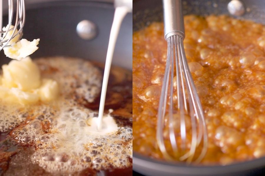 Ahora añade la mantequilla, la nata, la ralladura de la naranja y una pizca de sal. Apaga el fuego y con unas varillas integra todos los ingrediente hasta que deje de burbujear y se convierta en una aterciopelada crema de caramelo.