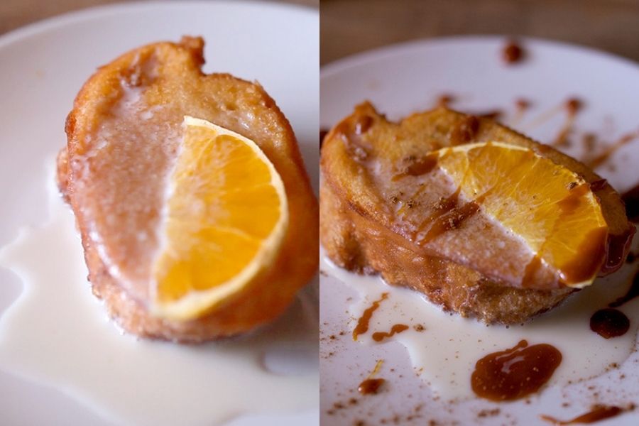 Torrijas de naranja y vino moscatel con caramelo salado