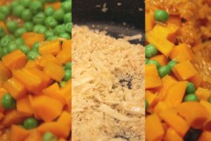 Pela y corta en brunoisse la zanahoria e incorpora a una cazuela hasta que esté tierna. En los últimos minutos agrega los guisantes, deja un minuto más y después reserva por separado las verduras y el agua.