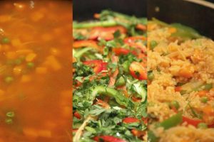 En una sartén grande y alta añade cuatro cucharadas de aceite de oliva e incorpora el arroz, los ajos cortados en laminas y la cebolla. Fríe todo junto hasta que tenga un bonito color dorado, aproximadamente por 7 minutos. Este paso es muy importante para conseguir que el arroz quede suelto y mucho más sabroso.