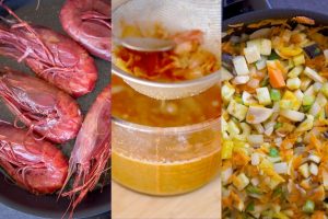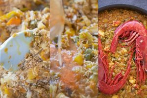 En los últimos minutos coloca encima del arroz las colas de carabineros partidas, los dos carabineros enteros y deja que se termine de hacer.