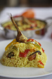 Cubre la base de una cazuela baja con aceite de oliva y rehoga en primer lugar los ajos laminados con la cebolla cortada en dados. Añade después los pimientos cortados algunos en cuadraditos y otros en tiras, remueve para integrar y sigue rehogando hasta que todos los ingredientes estén tiernos. Incorpora la cúrcuma, el azafrán y revuelve duranteunos segundos para que desprendan todo su aroma.