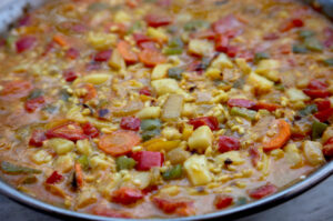 Calienta el aceite de oliva en una paellera y rehoga la zanahoria en rodajas junto a los pimientos, la cebolla y los ajos cortados en dados. Remueve de vez en cuando para que se cocinen muy bien por todos los lados.