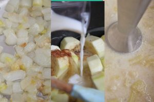 Incorpora el calabacín pelado, troceado y previamente sazonado para que suelte todo su jugo. Cocina durante cinco minutos e incorpora seguido el agua, la leche, la pimienta, y la nuez moscada al gusto. Deja hervir unos 20 minutos hasta que el calabacín esté completamente tierno.