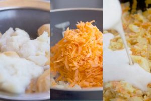 En una sartén calienta 3 cucharadas de aceite de oliva y fríe la cebolla con el ajo muy picadito. Cuando comiencen a estar suaves incorpora las zanahorias ralladas.