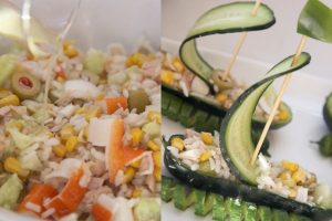 Listos unos divertidos barquitos de pepino con ensalada de arroz que cuando los vean no podrán resistirse.
