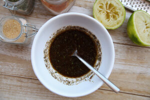 Combina todos los ingredientes del aderezo hasta conseguir una emulsión perfecta. Prueba y rectifica al gusto.