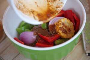 Corta en tamaños similares todas las verduras y transfiérelas a un recipiente. Vierte el aderezo y masajea con mimo hasta sentir que cada una de ellas está bien impregnada.Cubre con papel film y deja macerar durante 1 hora.