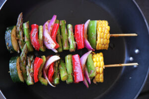 Mientras montas las brochetas alternando las verduras pon a calentar una plancha con un poco de aceite de oliva y cocina las brochetas durante 3-4 minutos por un lado y después otros 3-4 minutos por el otro lado.