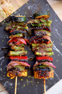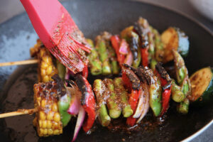 En los últimos segundos con el aderezo que quedo en el fondo del recipiente pincela por encima las brochetas. Sube la intensidad del fuego para que caramelice y adquieran un bonito color dorado.