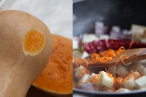 Lava y corta la calabaza longitudinalmente. Retira todas las semillas y las hebras. Haz un corte en la parte más abombada para que asiente bien en la fuente y no se columpie. Frota ambas caras con aceite de oliva, salpimienta y colócalas en una bandeja. Hornea a 180º durante 40 minutos o hasta que estén tiernas.