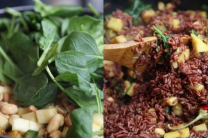 Después agrega los cacahuetes, la piña cortada en pequeños cubos, el curry y cocina durante 2-3 minutos más mezclando constantemente. Vuelca también el arroz junto a las espinacas y remueve hasta que marchiten.