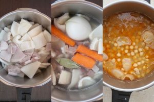 Ahora prepara los garbanzos que los has debido tener a remojo al menos 12 horas. Retira el agua de remojo, lávalos y vuélcalos en otra cazuela junto a una cebolla, la otra hoja de laurel, una pizca de sal, tres vasos del liquido que ha quedado después de haber cocido los callos y termina con agua normal hasta cubrirlos un dedo por encima.Cierra con una tapadera y cocina a fuego medio. Una vez suban las anillas de tu olla rápida mantén otros 10-12 minutos.