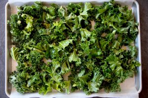 Cubre una fuente de horno con papel sulfurizado y extiende el kale de manera que no queden unas hojas encima de otras.