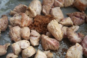 Comienza sellando el magro de cerdo en una sartén muy caliente con 2 cucharadas de aceite de oliva durante un par de minutos. Salpimienta al gusto, añade el azúcar integral y deja que caramelice unos instantes. Reserva.