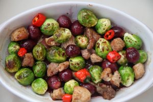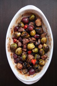 Coles de Bruselas asadas con uvas negras y vino tinto