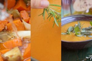 Introduce una ramita fresca de romero para perfumar delicadamente esta anaranjada crema de calabaza y remueve para que suelte toda su fragancia.