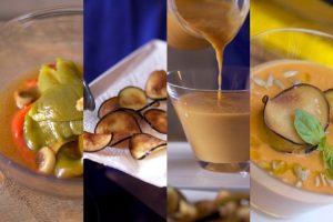Presenta en pequeños vasitos, o bien en raciones más grandes, tú decides. Decora con las pipas de girasol, la berenjena frita, unas gotas de aceite de oliva y unas hojitas de hierbabuena.