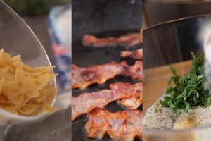 Vuelca la pasta en un recipiente junto a las judías, el calabacín cortado en dados y los cherry en gajos. Continúa con la lechuga picadita, las verdes hojas de rúcula, los granos de maíz y el crujiente beicon partido con las manos.