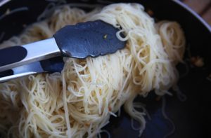 Pon abundante agua a cocer con una cucharadita de sal y una hoja de laurel. Cocina los espagueti hasta que estén al dente, después escurre reservando siempre algo de liquido de la cocción por si necesitará más jugosidad.