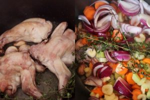 Una vez coja de nuevo temperatura regresa el conejo a la cazuela, los tomates ciruela o cherry, las aceitunas deshuesadas, una ramita más de tomillo y el caldo de pollo. Cubre con una tapadera y deja hervir a fuego medio-lento meneando ocasionalmente la cazuela durante 30 minutos o hasta que el conejo este tierno. -el tiempo dependerá del tamaño de las piezas de carne-